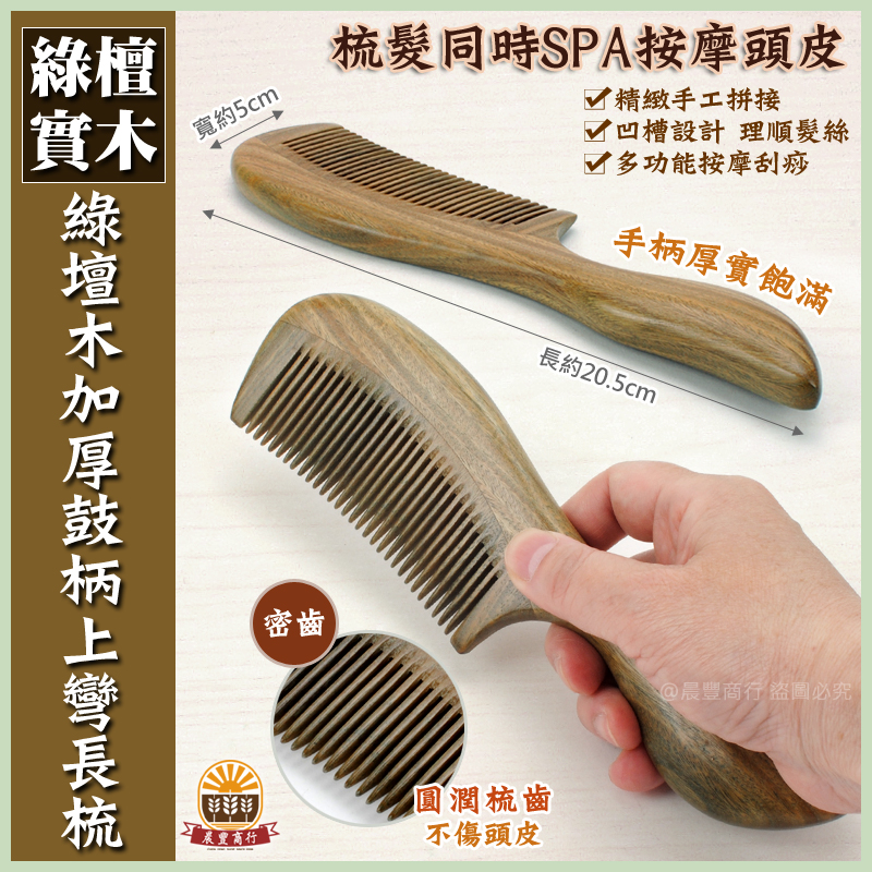 ★商品名稱: 綠壇木加厚鼓柄上彎長梳(總長20.5cm)/頭皮按摩神器/木製經絡按摩梳