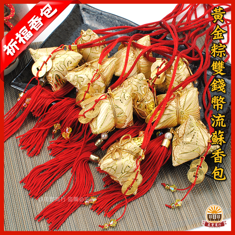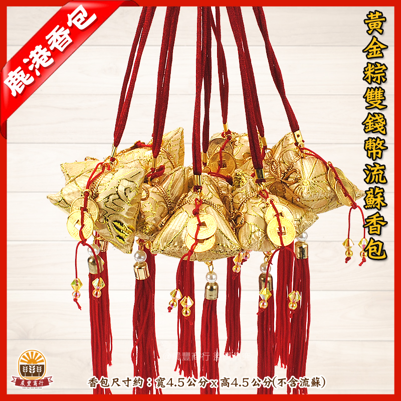 ★商品名稱: 黃金粽雙錢幣流蘇香包(4.5cm)-金色-台灣製