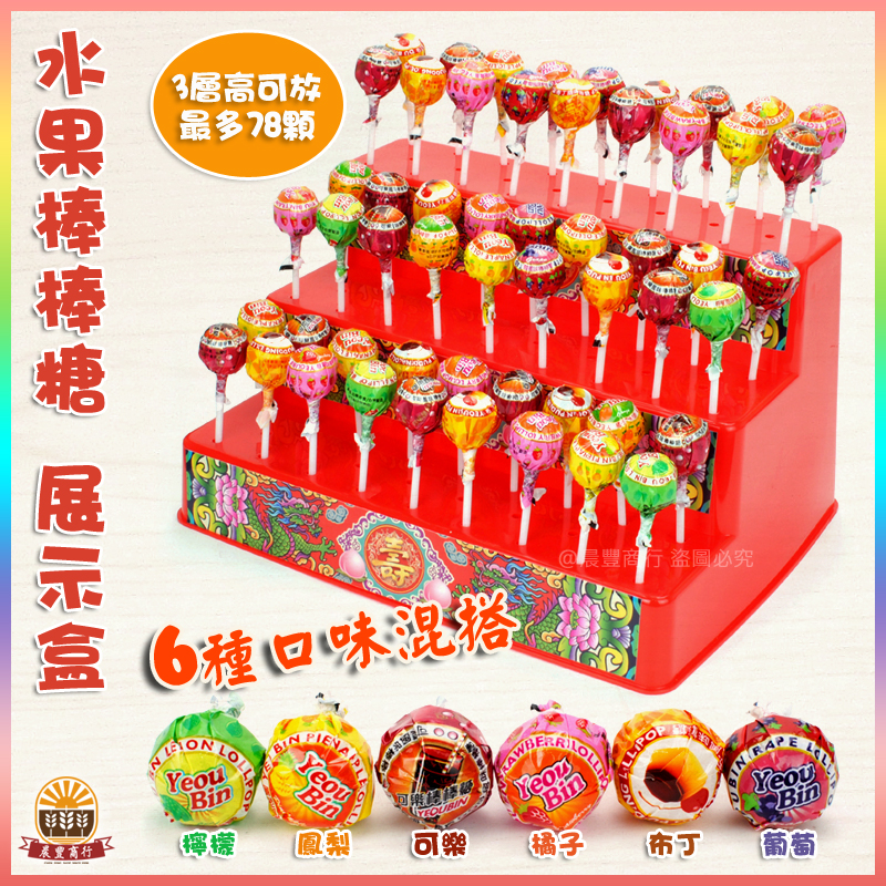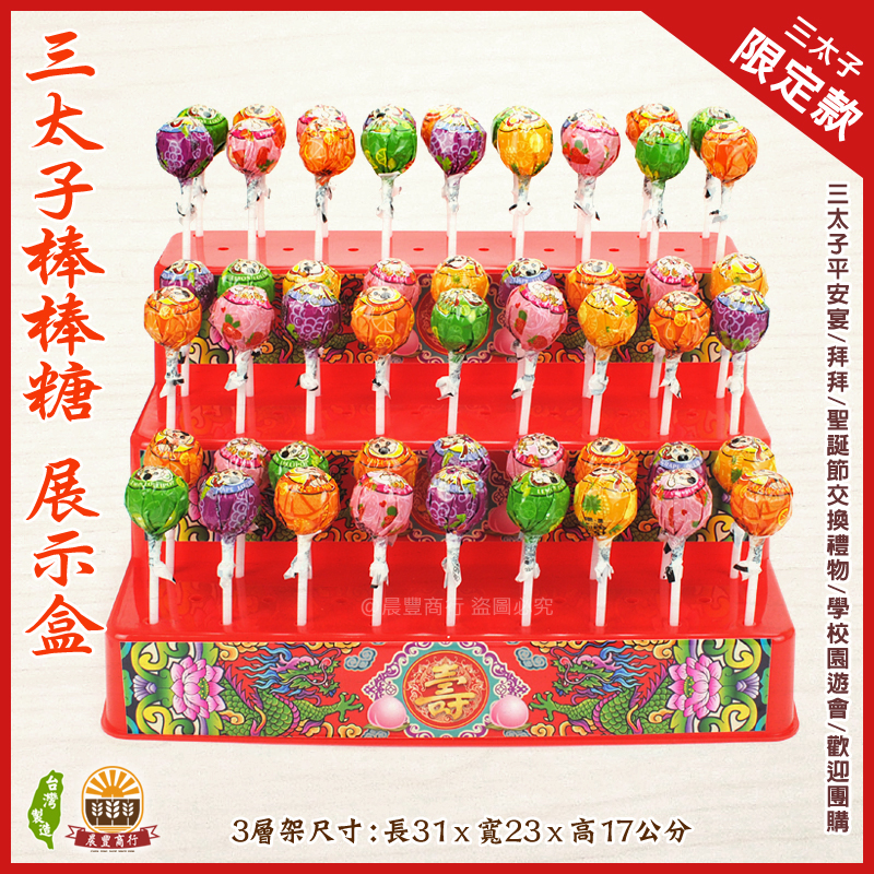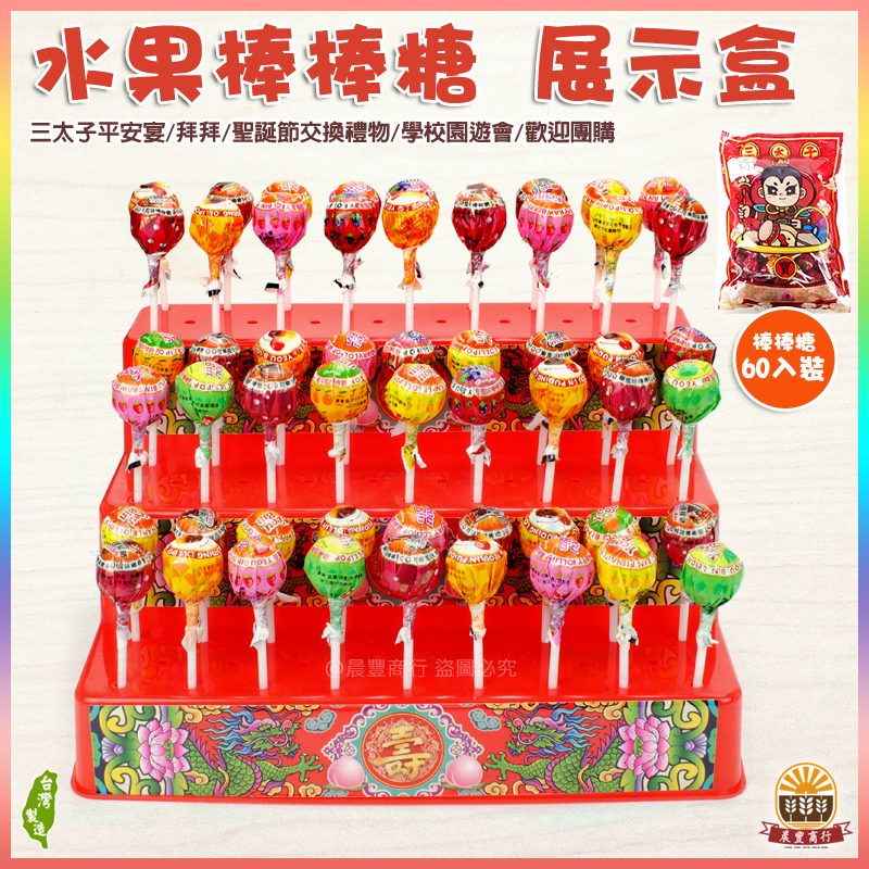 ★規格: 三太子棒棒糖 78顆+展示盒, 水果棒棒糖 78顆+展示盒